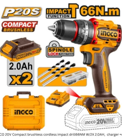 INGCO 20V Compact brushless cordless impact drill66NM W/2X 2.0AH, charger +case