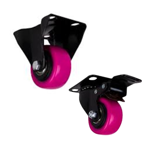 A 11/2 inch castor with a brake/locking mechanism and a pink polyurethane wheel. Prevents rolling and provides stability.